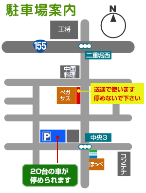 二重堀西(餃子の王将)の交差点を南に曲がり、200mほど先の左側です。